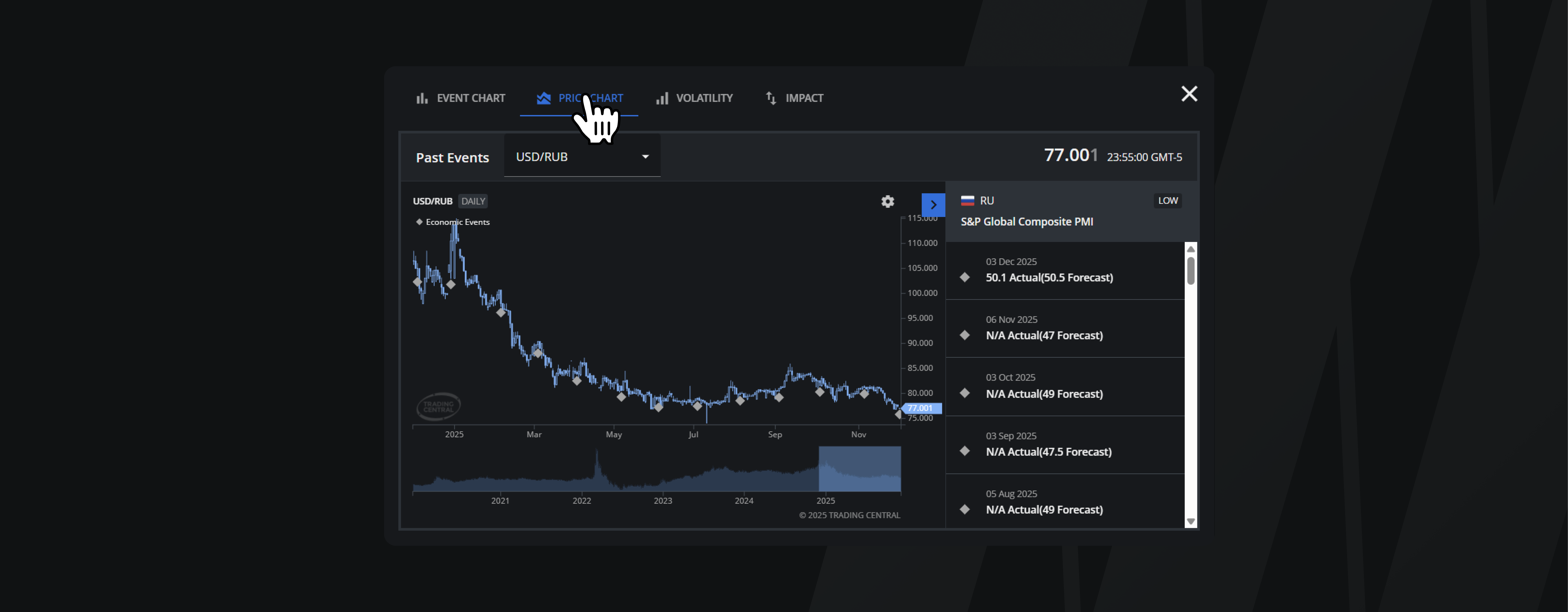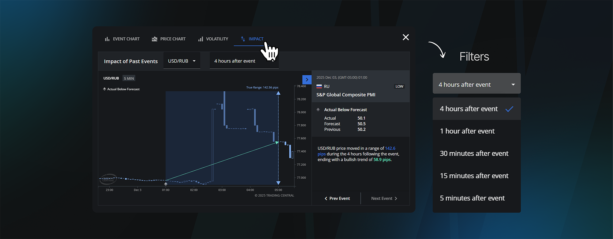 Get a clear view of each economic event, including timing, country, impact level, actual vs. forecast, and previous data
