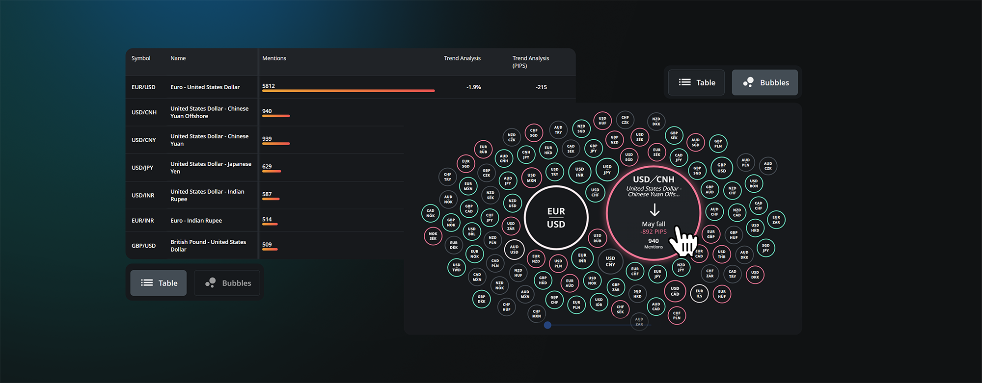 AI maps every pair into list or bubble layouts, amplifying the most talked-about assets into the largest visuals